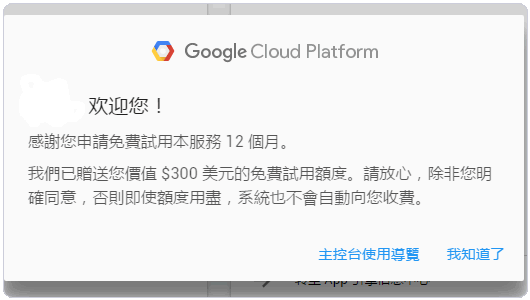 8、完成了信用卡验证后,你就可以看到 Google Cloud Platform 免费使用一年的 300 美元到账了。永久免费会直接应用到你创建的服务中。