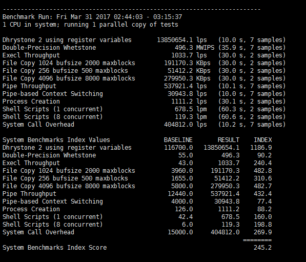 6、这是 UnixBench 测试 VPS 性能综合跑分,得分偏低了。(点击放大)