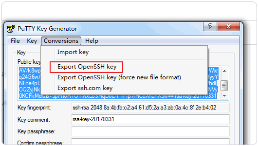 8、如果你想使用 Xshell,你需要在 PuttyGen 中导出为另一种 Key 格式。
