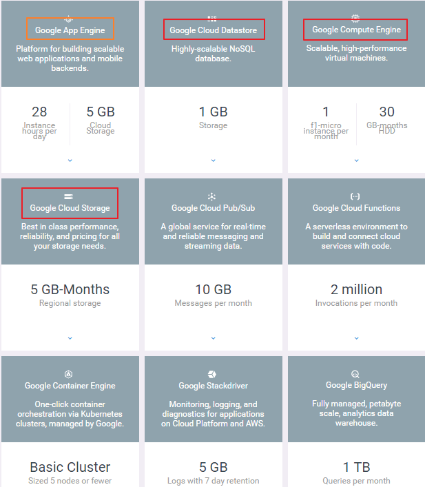 除了将 300 美元的使用额度延长一年外,Google Cloud Platform 还有永久使用额度,创建的 Google Compute EngineGoogle Cloud StorageGoogle Cloud Pub/Sub,只要是在 us-east1, us-west1, 和 us-central1 机房,免费容量分别是 5 GB 、2 GB 、3 GB。