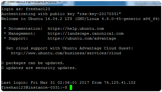 10、成功登录到 Google 云服务器中。