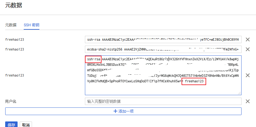 5、然后复制上面的公钥到元数据中,注意在公钥最后加上你的用户名,然后点击保存。(点击放大)