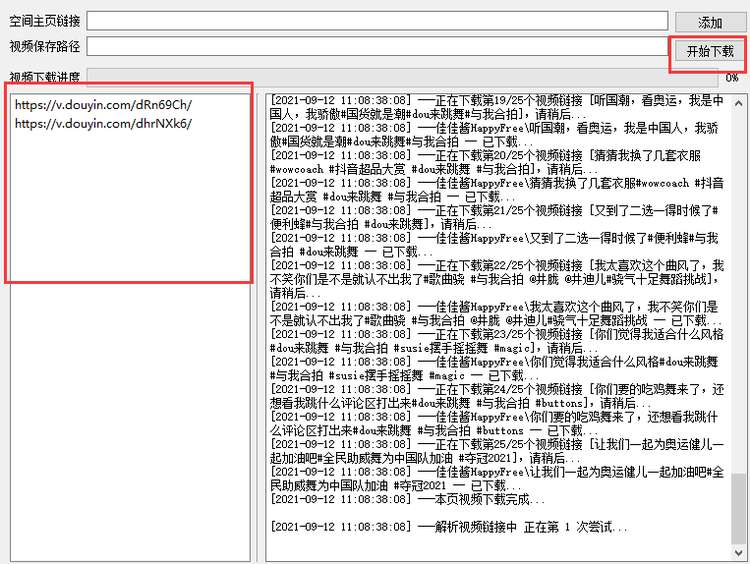 6、配置好过后,选中我们要采集的这个链接,再点击“开始下载按钮”,软件就会自动下载该主页的所有短视频。