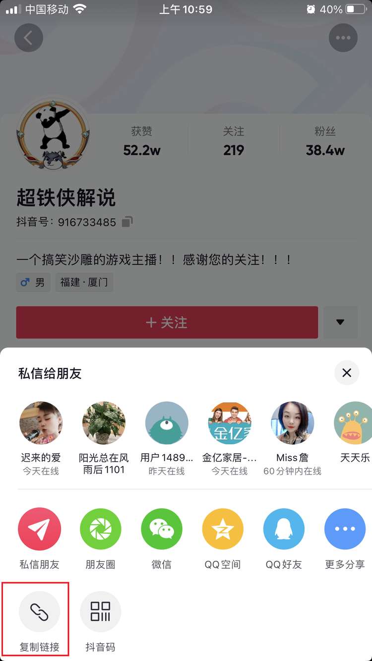 2、点击主页右上角上面的…符号,,再点击“分享主页按钮”,在弹出来的界面点击“复制链接”。