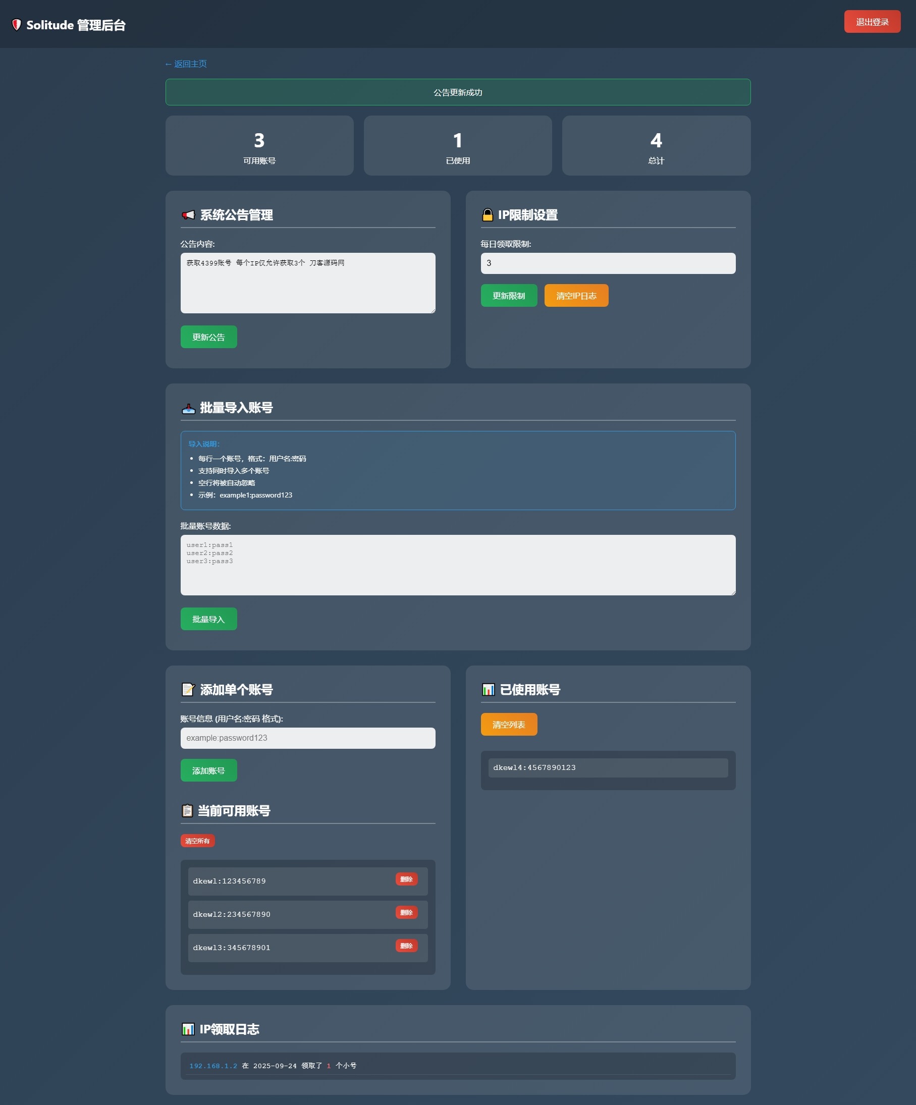 小号分发 卡密分发系统网站源码 轻量化admin7个月前发布关注07656小号分发 卡密分发系统网站源码 轻量化此内容为免费资源,请登录后查看雁翎0 登录查看免费资源 简介: 小号分发 卡密分发系统网站源码 轻量化 此为小号分发卡密系统源码,专用于分发小号库存账号或卡密等使用,不过规定每个IP仅能领取3次,也可视作小号分发工具。 已做过简易测试,感兴趣者可自行部署使用! 图片: © 版权声明 文章版权声明 1、本网站名称:鸿雁学习网 2、本站永久网址:https://cj.qhy.cc.cd/ 3、本网站的文章部分内容可能来源于网络,仅供大家学习与参考,如有侵权,请联系站长QQ125058596进行删除处理。 4、本站一切资源不代表本站立场,并不代表本站赞同其观点和对其真实性负责。 5、本站一律禁止以任何方式发布或转载任何违法的相关信息,访客发现请向站长举报 6、本站资源大多存储在云盘,如发现链接失效,请联系我们我们会第一时间更新。 THE END免费项目 喜欢就支持一下吧点赞56 分享QQ空间微博QQ好友海报分享复制链接收藏